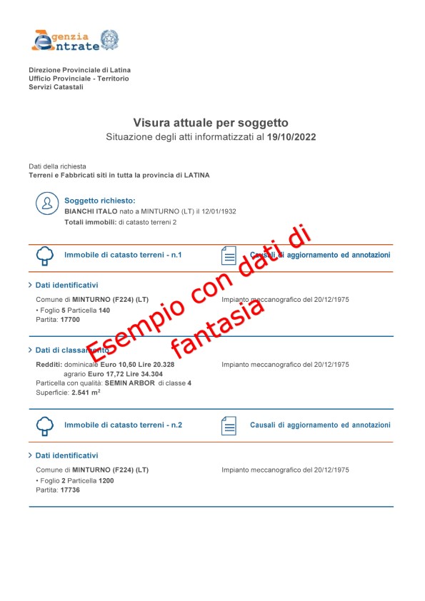 Questa tipologia di ricerca consente di visionare quanto risulta all'Ufficio del Catasto Italiano circa le proprietà immobiliari intestate ad un determinato NOMINATIVO su TUTTO IL TERRITORIO ITALIANO (es. Italia - ROSSI VITTORIO nato il 26/02/1922 a Lucca). La risposta include anche gli immobili delle provincie di TRENTO e BOLZANO